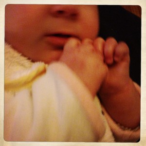 Elle bave, elle sourit, elle rigole, elle regarde ses pieds, arrive a les attraper parfois, mâchouille ses mains…Il suffit de dire piou piou, okaaaayyy, pouillou pouillou, a base de pow pow pow pow…